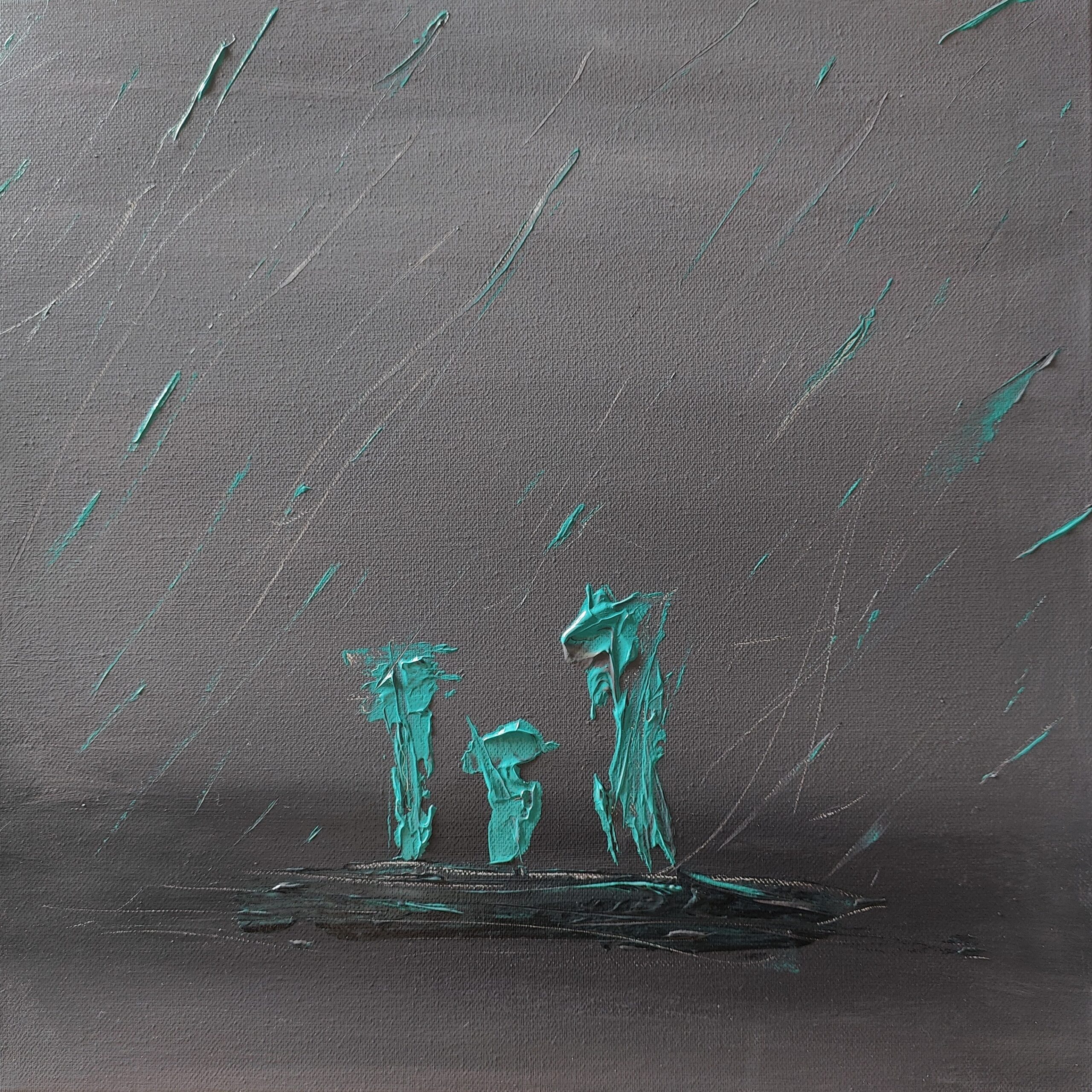 Im Zentrum dominieren dick aufgetragene, türkisfarbene Striche, die vertikal ausgerichtet sind. Diese Formen variieren in ihrer Größe und Intensität, wodurch sie eine dynamische Bewegung andeuten. Ihre Anordnung lässt Raum für Interpretationen: Sie könnten Bäume in einer kargen Landschaft oder Figuren darstellen, die sich auf einem Weg befinden, möglicherweise eine Familie, die sich in einer ungewissen, aber hoffnungsvollen Bewegung des Aufbruchs befindet.