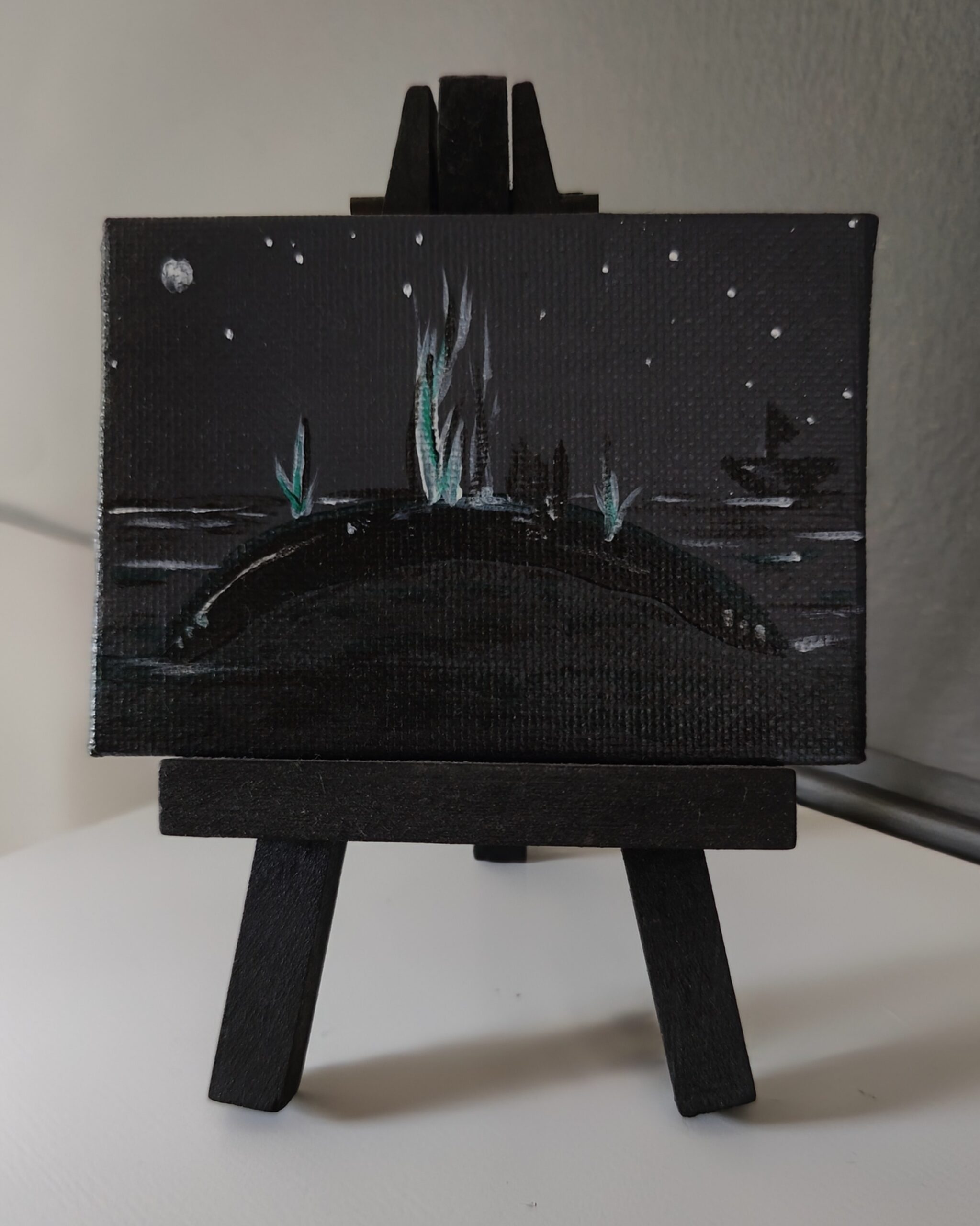 „Boot hinter Insel mit Bucht bei sternenklarer Nacht“ (2018)
