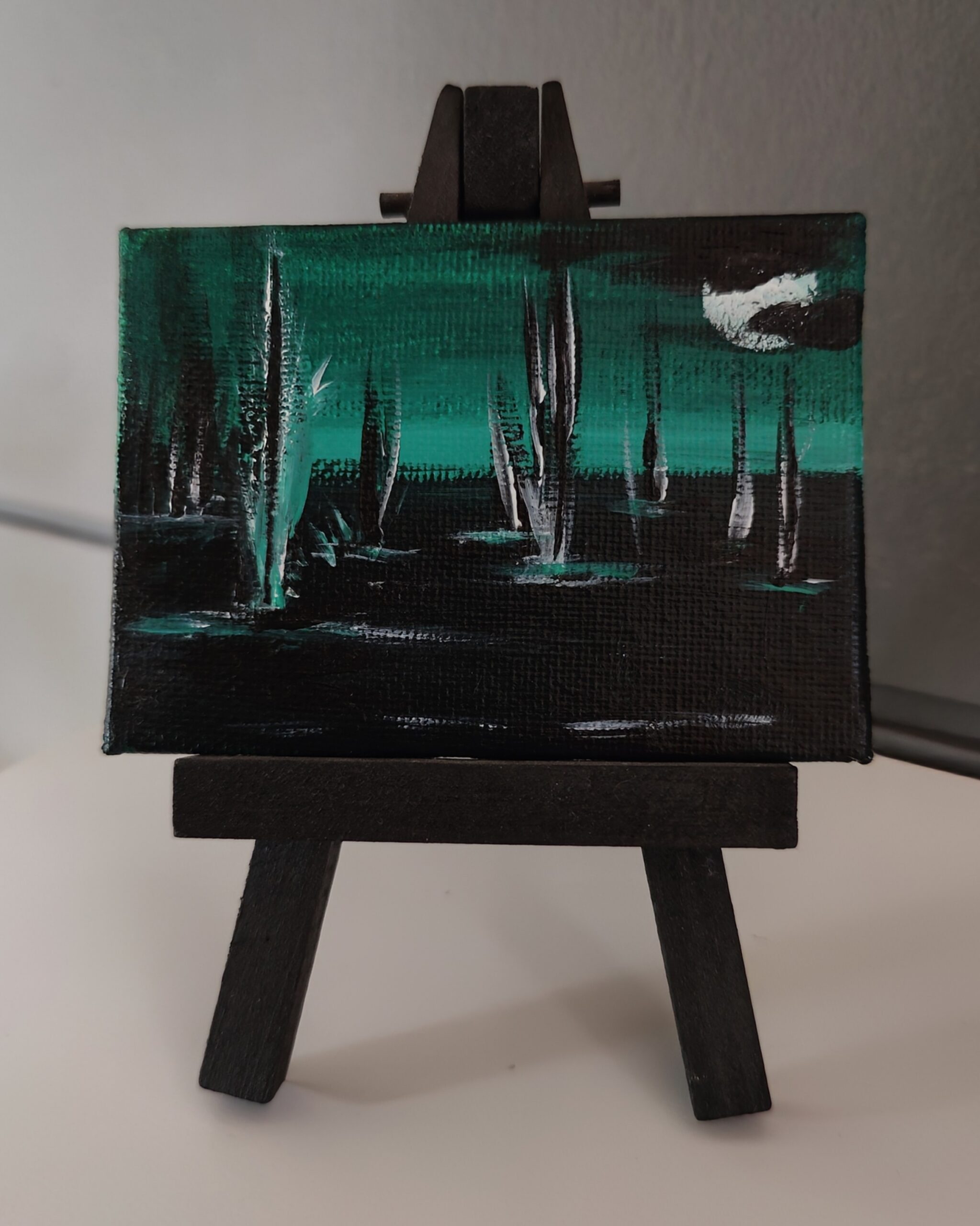 Hinter der Insel, leicht nach rechts versetzt, gleitet ein Segelboot still über das Wasser. Das Boot, dezent angedeutet, spiegelt eine leise Präsenz wider – ein Symbol für Einsamkeit oder Reise. Die cyanfarbenen Akzente, die das Wasser umspielen, verleihen der Szene einen Hauch von kühler Magie, während die wenigen weißen Sterne am Nachthimmel wie stille Wächter über das Geschehen wachen.