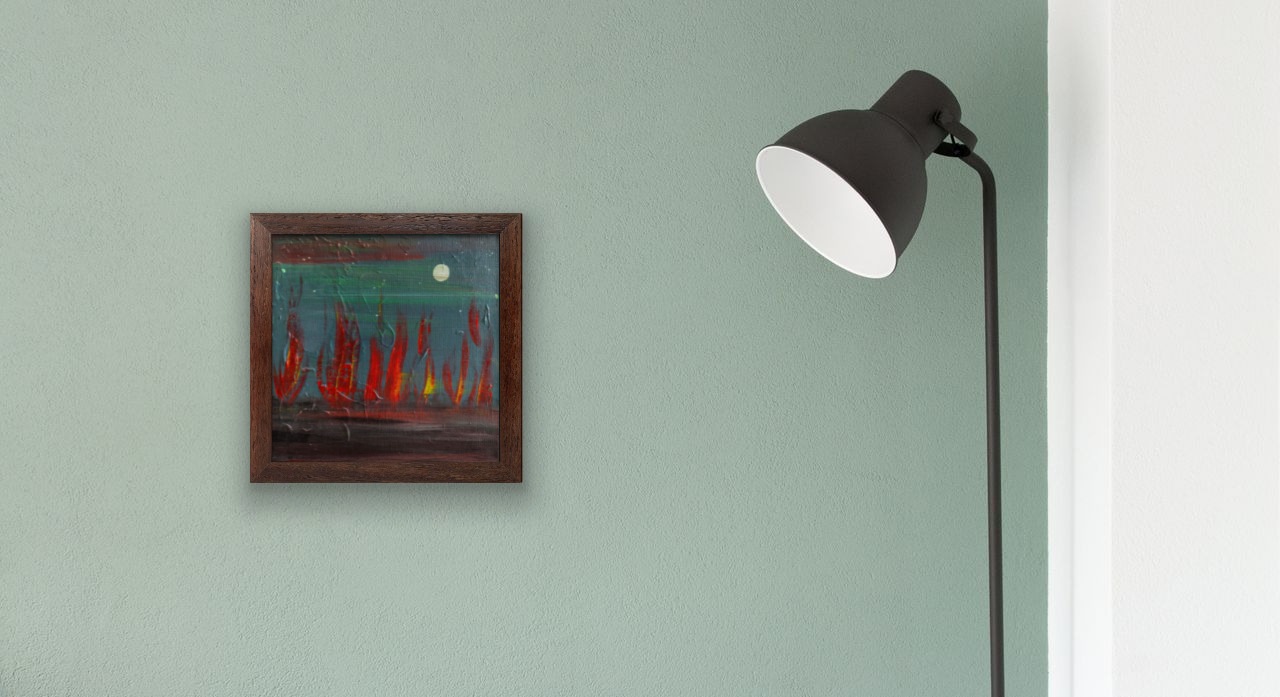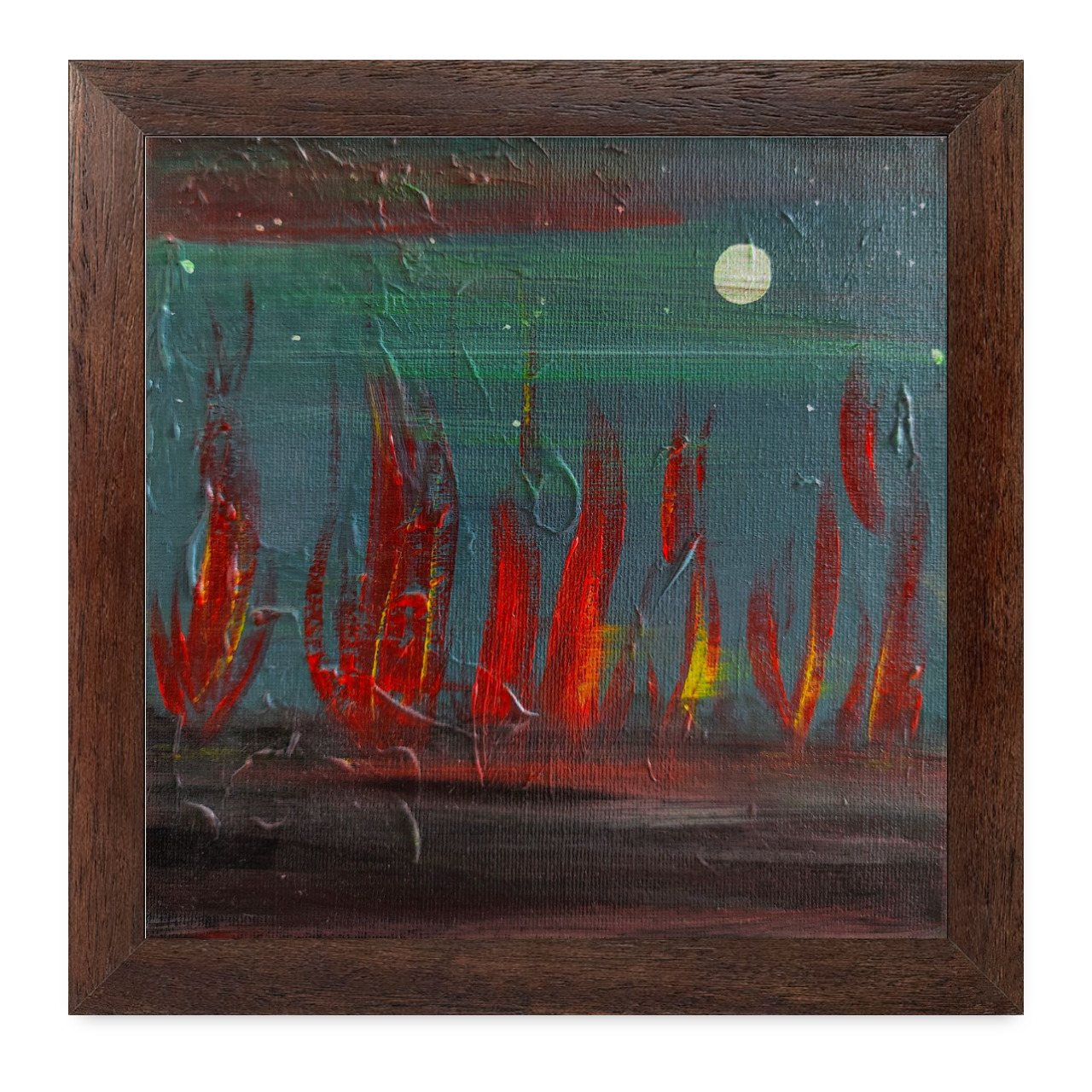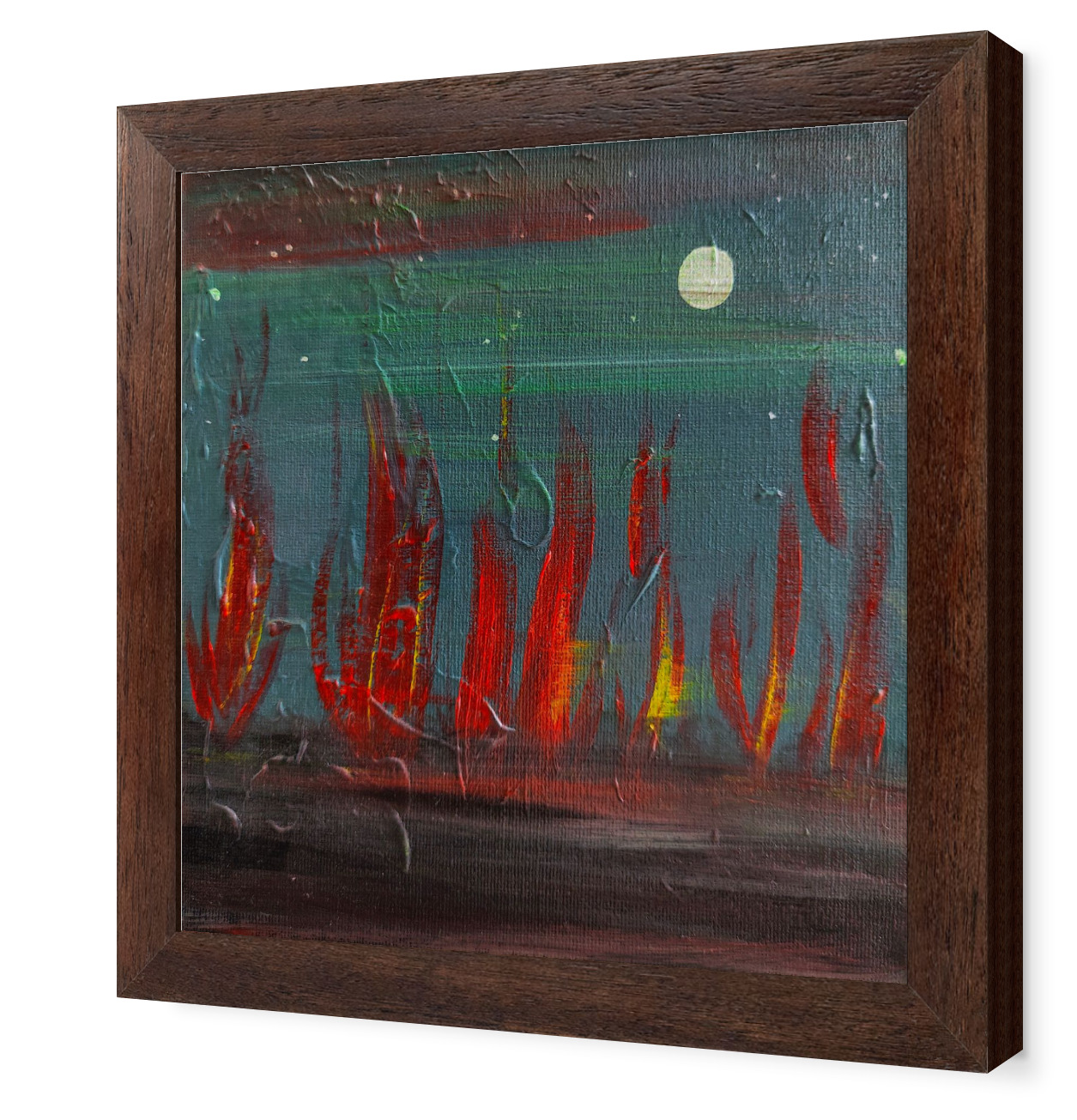 Die Bildmitte wird von mächtigen, roten Flammen dominiert, die sich in der gesamten Breite des Werkes emporrecken. Diese Flammen scheinen die Erde zu verschlingen, ihre Intensität und Bewegung füllen die Szenerie mit dramatischer Energie. Die Hitze der roten Farben steht im Gegensatz zur Kälte des blauen Himmels, was die Spannung und das Chaos in der Szene noch verstärkt.