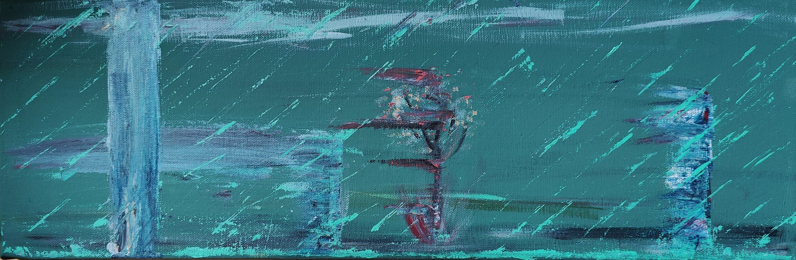 Die gesamte Szenerie wirkt düster und melancholisch, ein Gefühl, das durch die kühlen Farben und die Darstellung des unaufhörlichen Regens verstärkt wird. Die Komposition spielt mit der Spannung zwischen Zerstörung und Überleben, zwischen Kälte und Wärme sowie zwischen Bewegung und Starre. Die abstrakte Formsprache des Gemäldes lädt den Betrachter ein, die Elemente der „Eiswelt“ und ihre Symbolik selbst zu interpretieren.