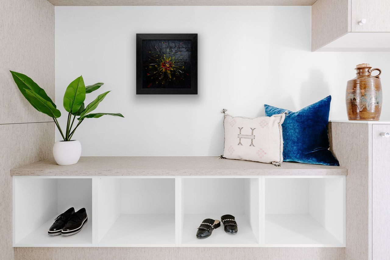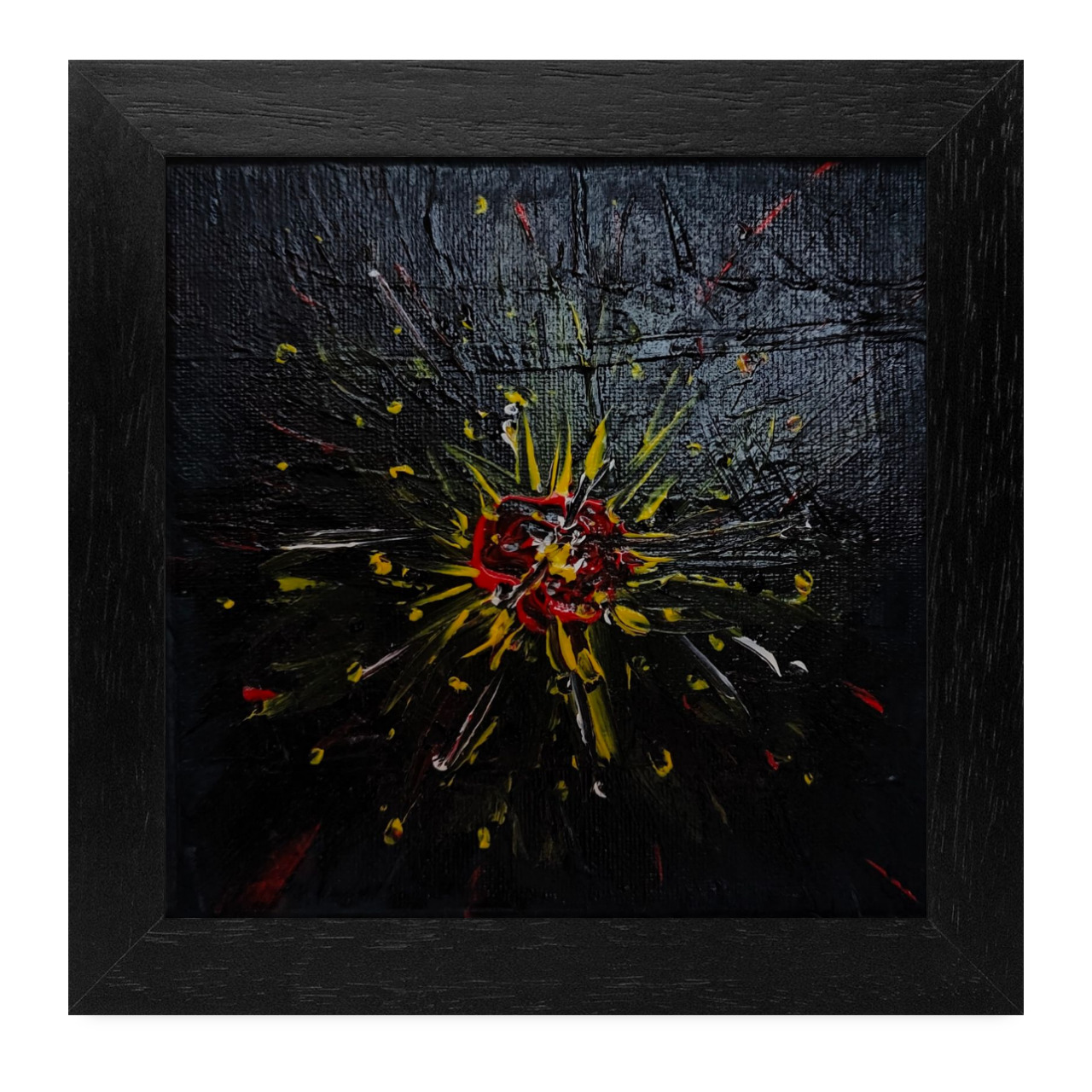 Das Werk „Explosion der Blütengalaxie“ strahlt eine überwältigende Dynamik und Tiefe aus. Die dominante Farbe, ein tiefes, beinahe allumfassendes Schwarz, bildet den mystischen Hintergrund und verleiht dem Bild eine unendliche Dimension. Über diese dunkle Leinwand brechen kraftvolle Akzente in Gelb und Rot hervor, die sich wie glühende Explosionen entfalten.