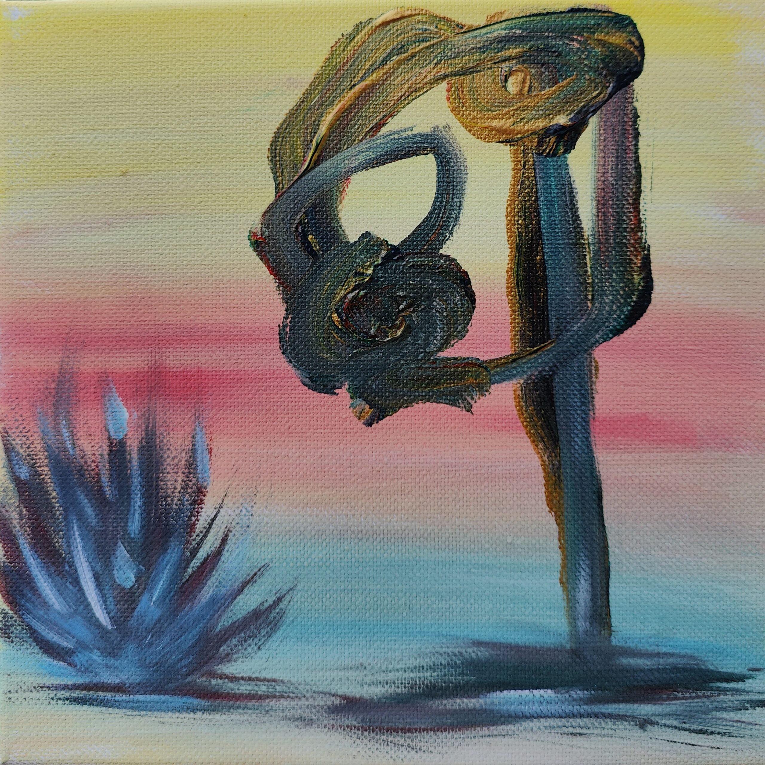 Der Hintergrund ist in sanften Farbverläufen von Gelb, Rosa und Hellblau gestaltet und erzeugt eine harmonische, fast träumerische Atmosphäre. Die Farben wirken wie ein Sonnenaufgang oder eine Abenddämmerung, was die Szene in eine ruhige und zeitlose Stimmung versetzt. Links im Bild ist eine abstrakte Form zu sehen, die an eine Pflanze oder eine Flamme erinnert, gemalt in kühlen Blau- und Türkistönen, die einen Kontrast zu den warmen Hintergrundfarben schaffen.