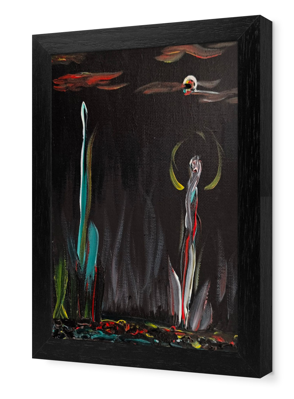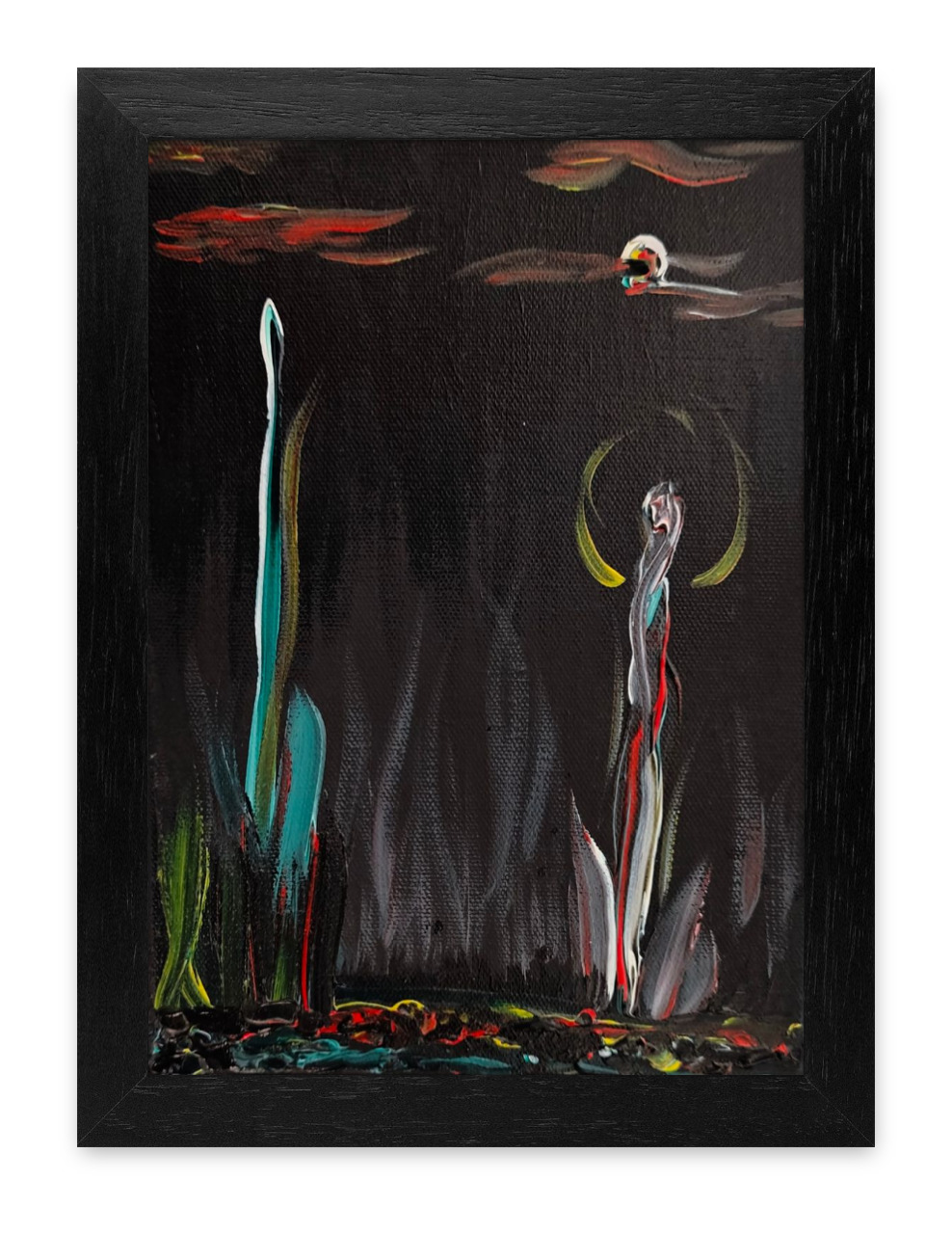 Das Gemälde „Pflanzenspross mit Biolumineszenz“ vereint kosmische Weite mit der fragilen Schönheit des Lebens. Vor einem tiefschwarzen Hintergrund ragen zwei keimende Pflanzensprossen empor, die durch zarte, biolumineszierende Akzente in Gelb, Rot, Blau und Weiß in magischem Licht erstrahlen. Diese Sprossen scheinen nicht nur zu wachsen, sondern auch Energie zu verströmen – eine Verbindung von Natur und futuristischer Vision.