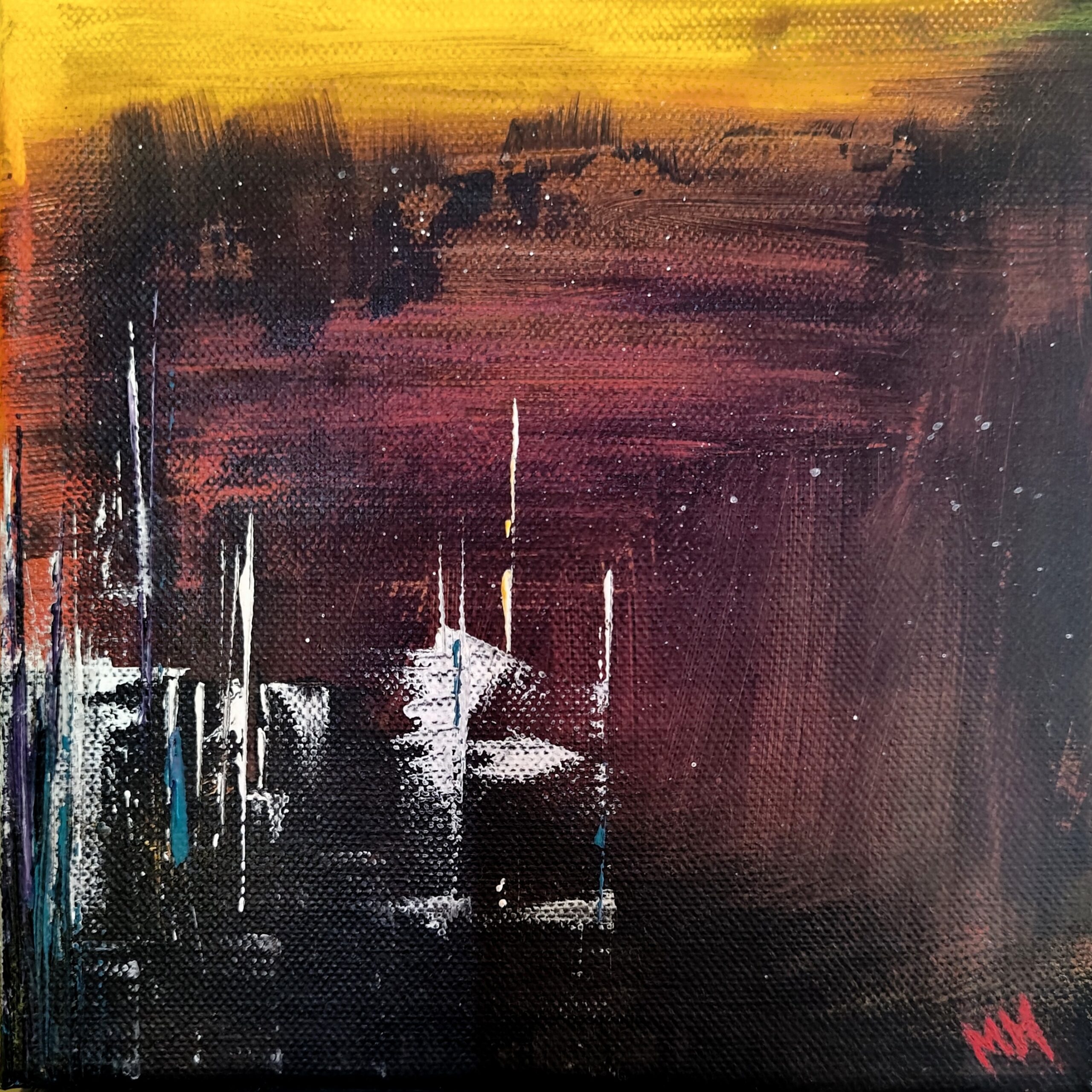 Das Werk „Segelboote am Hafen“ von Martin Hollwitz aka Neo Lectro ist eine abstrakte Darstellung eines Hafens in der Dämmerung oder bei Nacht. Das Gemälde ist geprägt von einem warmen, leuchtenden Gelb im oberen Bereich, das den Himmel symbolisieren könnte. Dieses Gelb geht sanft in ein intensives Rot und Dunkelbraun über, wodurch eine dramatische und stimmungsvolle Atmosphäre entsteht.