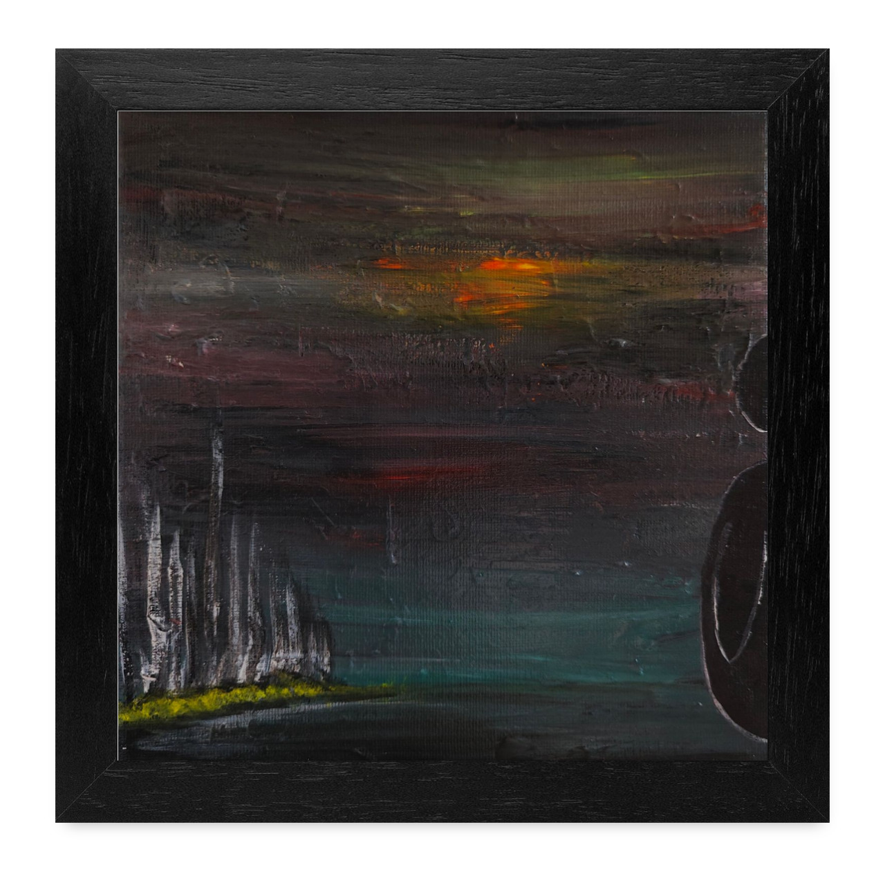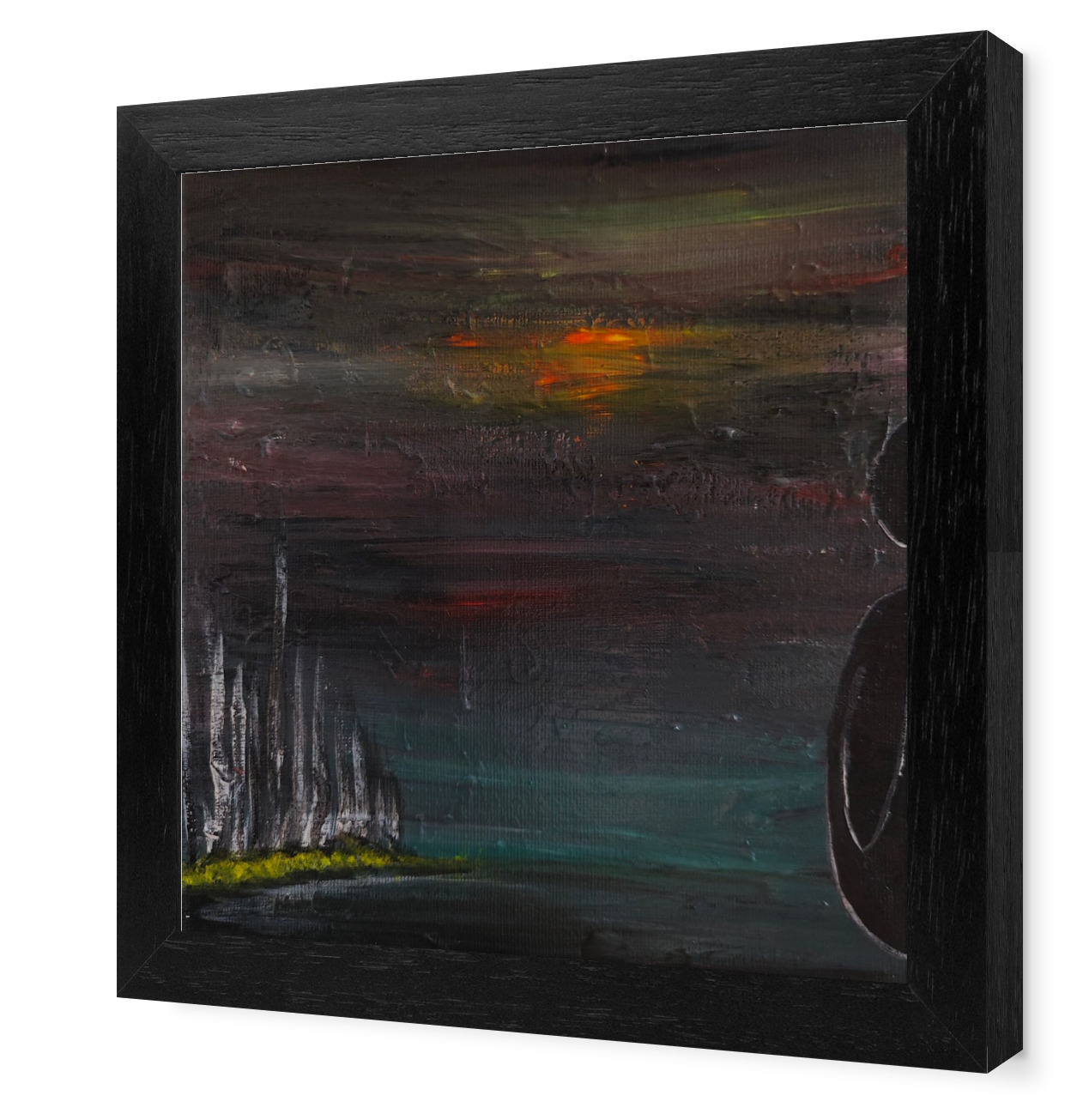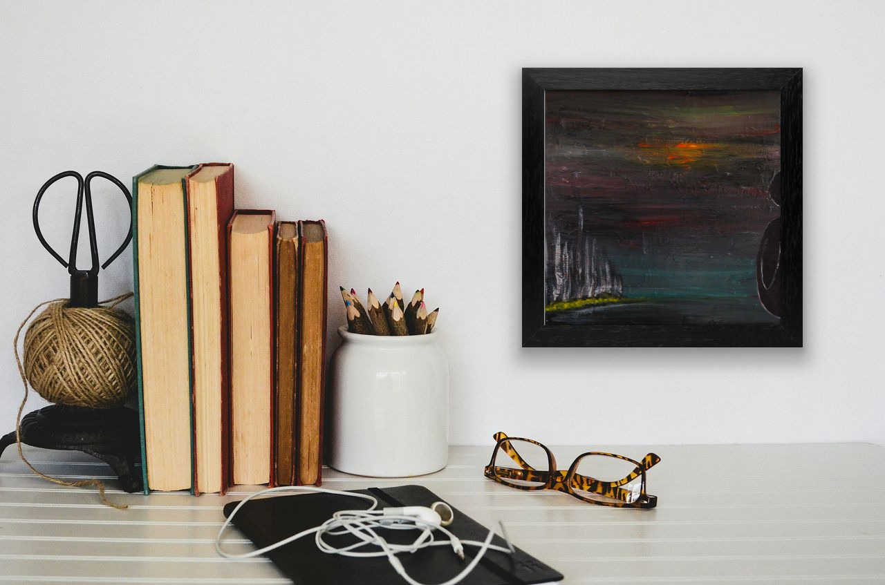 Die gesamte Komposition von „Sonnenuntergang auf Planet X“ wirkt geheimnisvoll und introspektiv, als ob sie eine Geschichte von Vergänglichkeit und der Suche nach Bedeutung in einer düsteren, leeren Welt erzählt. Die starke Farbkontraste und die sparsame Verwendung von Figuren und Formen schaffen eine meditative Stille, die den Betrachter in eine tiefere Auseinandersetzung mit dem Bild und der dargestellten Welt einlädt.