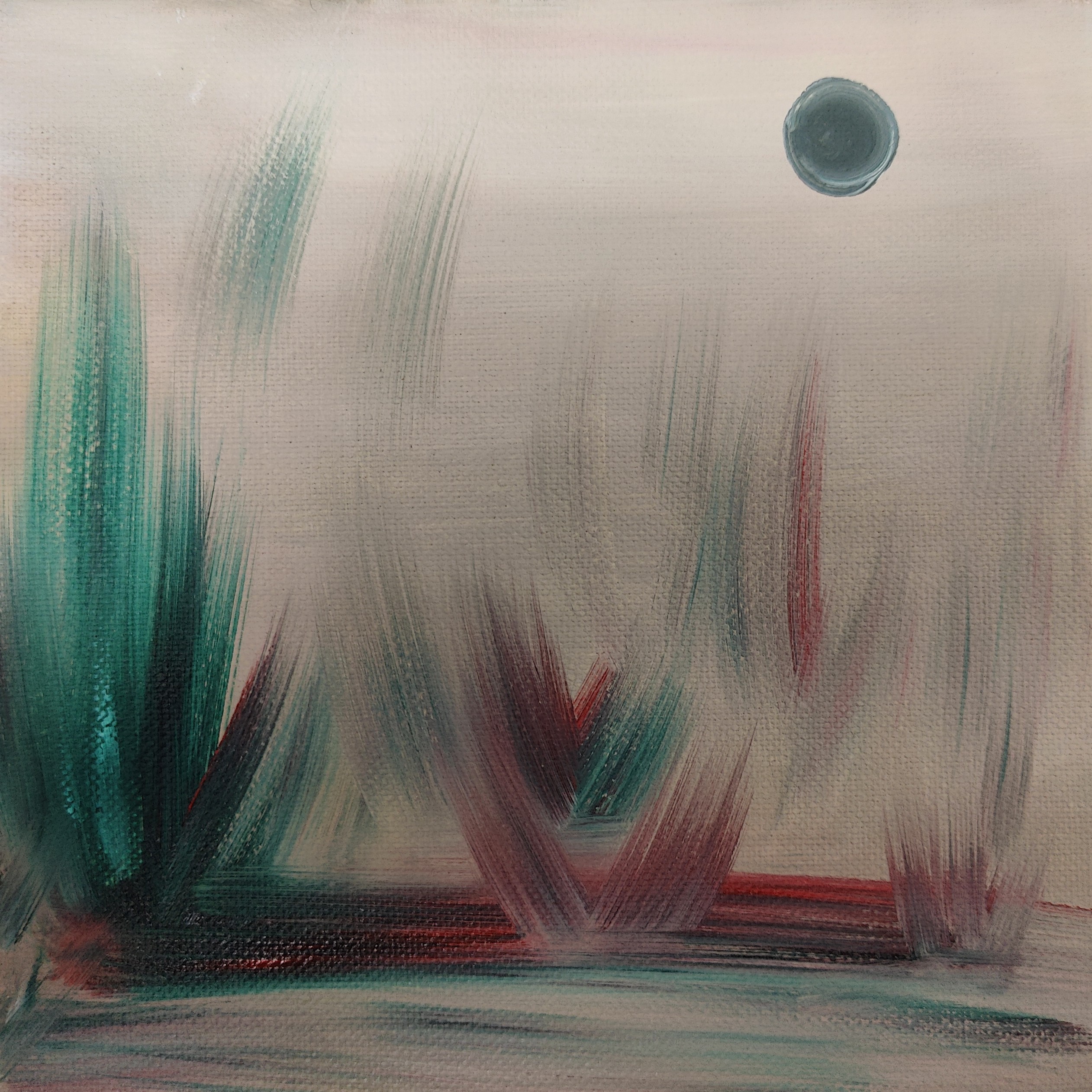 Im unteren Bildbereich zieht sich ein sandiger, flacher Boden, der durch horizontale Linien und subtile Farbverläufe in Türkis und Rotbraun abstrahiert dargestellt wird. Daraus erheben sich vereinzelt buschige Sträucher und Pflanzen, die durch vertikale Pinselzüge in sattem Grün und dunklem Rot akzentuiert sind. Diese vegetativen Formen wirken geisterhaft und bewegen sich scheinbar im Wind, was dem Werk eine dynamische Ruhe verleiht.